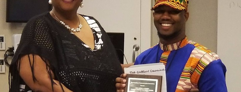 This year’s recipient, Lionnell Smith, currently serves as Assistant Professor of Speech at Voorhees College in Denmark, SC. He is a member of Carolinas Communication Association and led a panel titled “Vibranum Velocity” at the 2018 CCA Conference last weekend in Charlotte, NC. Jayme Bradford Kinard, also of Voorhees College, was invited to present the award to her former student, now colleague.